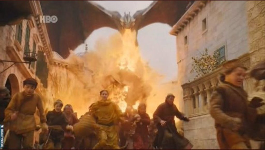 A pesar de que las campanas sonaron en el Desembarco del Rey como signo de que se habían rendido, además que Daenerys ya se había encargado de quemar gran parte de los alrededores, poco sirvió la petición que le realizó Tyrion Lannister a la Reina de los Dragones al inicio del episodio, pues el fuego fue probablemente lo que más vimos durante todo el episodio.